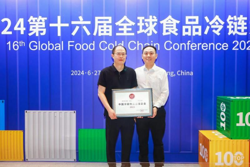 紅星冷鏈第一副總經(jīng)理吳波(左邊)領(lǐng)取“冷鏈物流百?gòu)?qiáng)”獎(jiǎng)牌